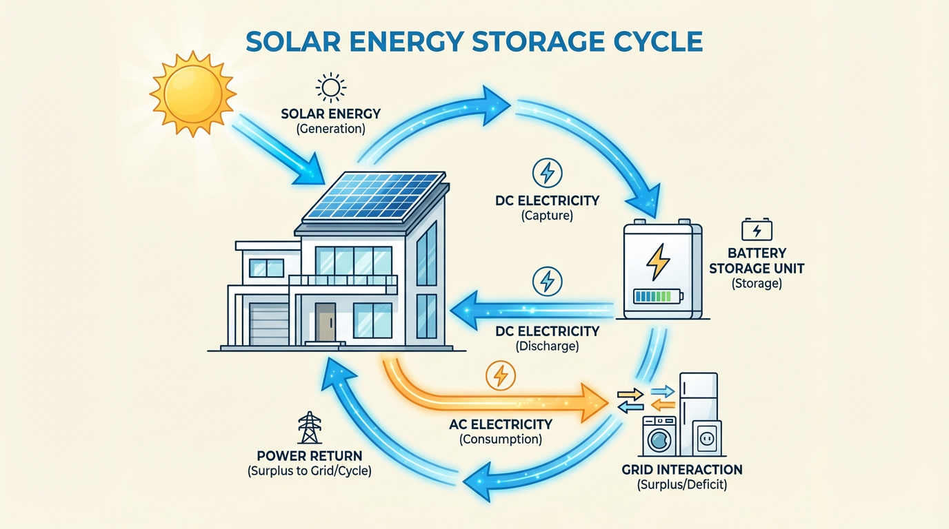 A solar battery storage system captures excess electricity your panels generate during the day and stores it for use at night, during outages, or peak pricing hours. A hybrid inverter manages energy flow, converting DC power from panels to AC for home use and directing surplus power to the battery for later deployment.